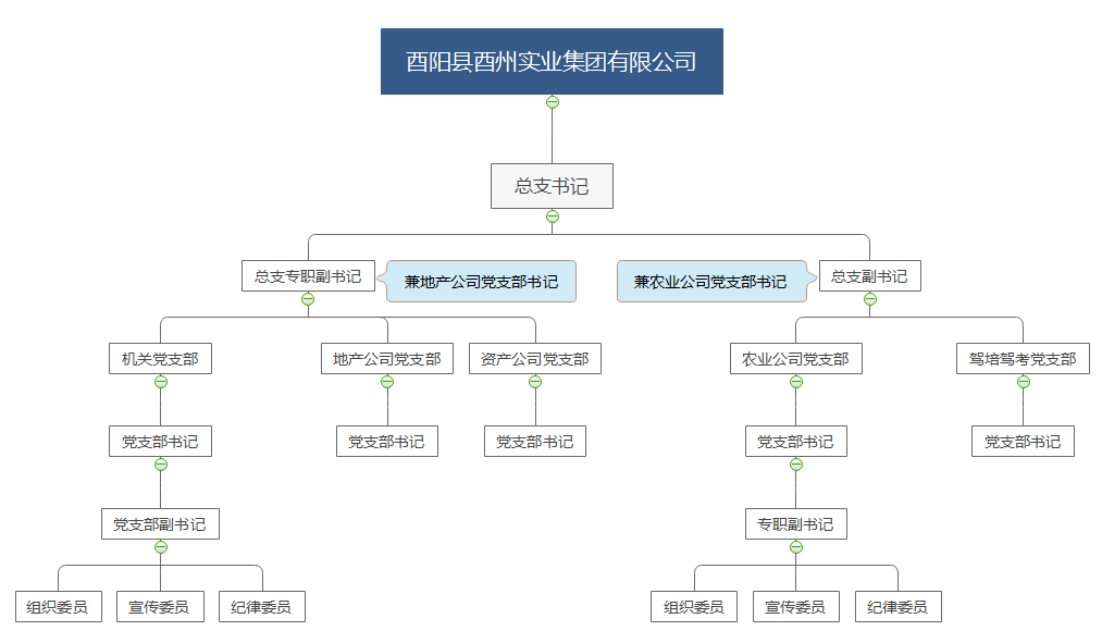 酉陽縣酉州實業集團黨支部成立于2015年5月,2019年12月成立黨總支,下轄五個黨支部,分別為機關黨支部、酉州資產公司黨支部、酉州地產公司黨支部、酉州生態農業公司黨支部、駕培駕考黨支部。現有正式黨員39名,預備黨員4名,入黨積極分子9名,其中男黨員32名,女黨員11名,大學專科以上學歷 36人,黨總支由支部書記、專職副書記、紀律委員、組織委員、宣傳委員5人組成。在上級黨組織的領導下,集團各支部堅持以習近平新時代中國特色社會主義思想為指導,切實抓好黨員的管理和監督,不斷增強黨建工作的動力和活力,扎實開展創先爭優活動,為建設一流的黨總支不懈奮斗,充分發揮黨建引領國企改革發展的先鋒模范作用,集團先后獲得“重慶市五.一勞動獎狀”、“重慶市扶貧先進集體”、“重慶市AAA級和諧勞動關系企業”縣國企基層黨建示范點等殊榮。